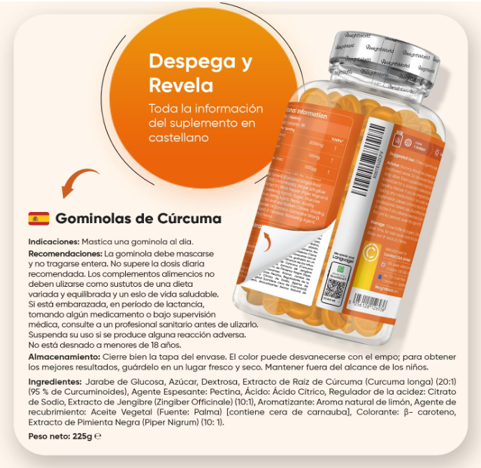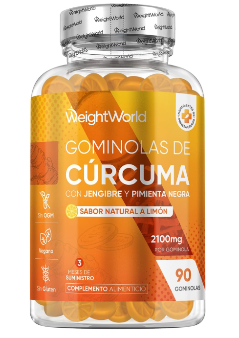 - ¿Por Qué Escoger Suplemento de Gominolas de Cúrcuma de Weightworld? - El suplemento vegano en gominolas con sabor natural a limón de cúrcuma con jengibre y pimienta negra, ofrece 2000 mg de cúrcuma pura, 100 mg de extracto de raíz de jengibre y 1000 mcg de pimienta negra por gominola diaria.